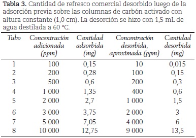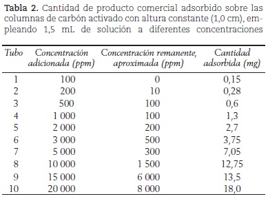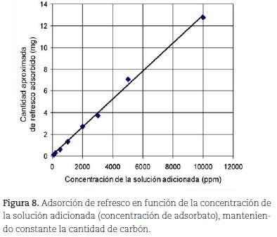 Por otra parte, la tabla 2 y la figura 8 muestran los resultados de adsorción del refresco frutiño con respecto a la variación en la concentración de la solución adicionada (C), conservando constante la altura de la columna de carbón activado (1 cm). En la figura 8 se eliminaron los últimos dos puntos de la tabla 2 (a las más altas concentraciones), con el objeto de mejorar la linealidad. Esta figura, revela claramente una dependencia lineal que pasa por el origen (r = 0,9985), típica de una relación directamente proporcional entre dos variables. Por tanto, a partir de la figura 8, y teniendo en cuenta que los ensayos se realizaron en tiempos iguales (de esta manera la velocidad de adsorción queda definida por la cantidad adsorbida,