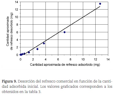De otro lado, los resultados del ensayo de desorción (cantidades de colorante desorbido) se presentan en la tabla 3 y la figura 9 (r = 0,9916), y muestran una proporcionalidad entre las cantidades desorbidas y adsorbidas (la cantidad adsorbida también es un indicativo de la fracción de área cubierta: Ø). Como el tiempo es constante en los experimentos, entonces puede deducirse que la velocidad de desorción