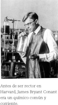 El profesor Gerald Holton quien escribió un maravilloso libro de historia de las ciencias físicas (incluida la química dentro de ellas; Holton & Roller, 1958) nos explica en un artículo reciente lo que pueden hacer los historiadores de la ciencia con los profesores de ciencia (Holton, 2003). Antes de empezar nos habla del alejamiento relativo entre los historiadores y los profesores, de sus "dos culturas". Lo más notable es en cuanto dice: "La mayor parte de las empresas que publican libros de texto, las cuales en los Estados Unidos actúan como si fueran el Ministerio de Educación, no permiten colocar espacios en los libros de ciencia para algo más que un anécdota histórica." Luego pone algunos grandes ejemplos de científicos que dedicaron buena parte de su vida a realizar estudios históricos para su utilización en la enseñanza entre ellos vuelve a aparecer James B. Conant.