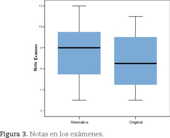 En promedio, los estudiantes que cursan el práctico con la estrategia alternativa presentan notoriamente mejores notas en los exámenes; sin embargo, el test de t no muestra diferencias significativas (t = 0,883; p-valor = 0,382).