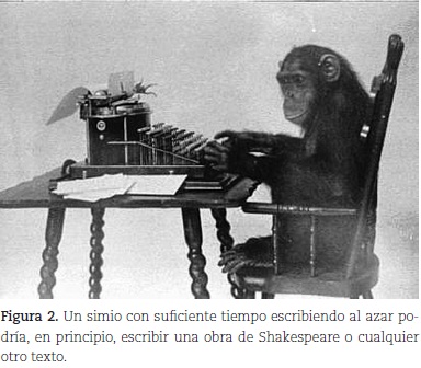 Quizás una de las claves más sólidas para tratar de resolver esta paradoja fue propuesta por Dawkins (Dawkins, 1987) en El relojero ciego, en donde se plasma una discusión sobre la evolución por la acumulación de pequeños cambios. Dawkins tomó el comentario de Hamlet a Polonius "Methinks it is like a weasel" (creo que se parece a una comadreja) y se preguntó cómo a partir de sus componentes más simples, letras y espacios, se puede generar una frase con cierto sentido. Obviamente, el ejercicio mental debía ser un reto, por lo cual, involucró a un simio para teclear dicha frase (figura 2). La frase contiene 28 caracteres, incluyendo cinco espacios. Así, existen 27 posibilidades para localizar al azar 26 letras del alfabeto inglés y un espacio en cada una de las 28 posiciones. Un simio, entrenado para teclear al azar en una máquina de escribir, quizá requiera cerca de 2 728 = 1040 golpes. Dawkins planteó una segunda opción donde ahora el simio no cambiase las letras una vez que ellas se encuentren en el lugar correcto, lo que le permitiría escribir la frase empleando sólo unos miles de golpes a las teclas. La diferencia primordial es que en el primer caso se emplea una búsqueda completamente aleatoria, mientras que en la segunda, las frases intermedias del proceso, con letras parcialmente correctas, se identifican como tales y se guardan en una memoria virtual. Así, en analogía a este planteamiento, la esencia del plegamiento proteico es la retención de los intermediarios parcialmente correctos.
