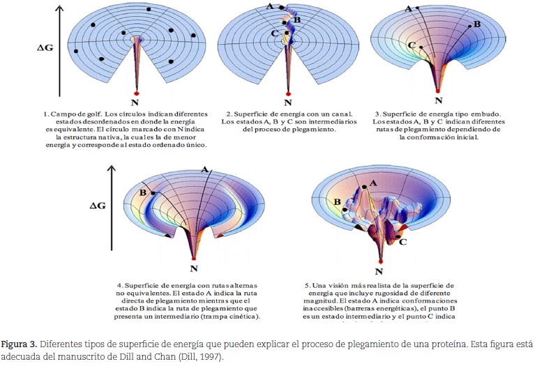 Teniendo en cuenta estos datos se ha propuesto una solución alternativa a la paradoja de Levinthal. Ya que la energía de plegamiento de una proteína se asemeja a un embudo (figura 3, 3-5) y que la proteína se pliega por rutas diferentes dependiendo de la conformación en la que se encuentre en el estado desplegado, entonces cada ruta seguirá la línea de menor energía desde esta conformación hasta la estructura nativa (Dill y Chan, 1997). Una imagen ilustrativa de este proceso es la forma en que las gotas de agua alcanzan el fondo de un embudo siguiendo las líneas de máxima pendiente y sin necesidad de recorrer toda la superficie del embudo (figura 3,3).