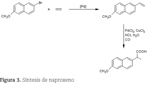 La reacción de Heck tiene múltiples aplicaciones tanto a escala de laboratorio como industrial; un ejemplo representativo es la producción de naproxeno (figura 3), en la cual uno de los pasos fundamentales se realiza mediante un acoplamiento tipo Heck.