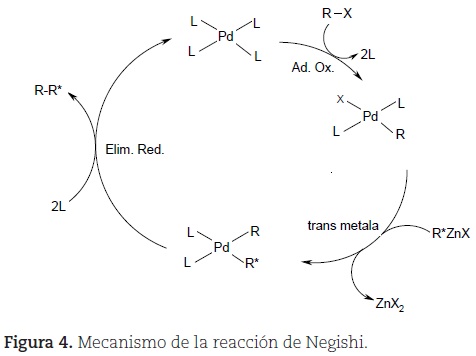 En forma enteramente similar al acoplamiento de Heck, el caso Negishi realiza una reacción de acoplamiento cruzado usando paladio, un halogenuro orgánico y un organozinc para dar un nuevo enlace C-C y en consecuencia la formación de una nueva molécula orgánica de acuerdo con el siguiente mecanismo de la figura 4.