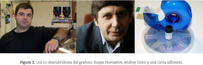 Varios grupos de investigación alrededor del mundo, en particular el dirigido por Philip Kim en la Universidad de Columbia, buscaban maneras de separar las capas individuales del grafito. En la aproximación de Kim, un cristal de grafito se colocaba en la punta de un microscopio de fuerza atómica (afm) y con éste se marcaban las caras estructurales de una superficie de silicio (un "nano lápiz"; Geim & Kim, 2008; Novoselov et al., 2005). De esta manera, podían obtener hojuelas de entre 10 a 20 hojas. Fue el azar (esa lotería que premia de formas misteriosas a un investigador) lo que permitió a los físicos Andrey K. Geim y Kosya S. Novoselov descubrir que con cinta adhesiva simple podían remover por fuerza bruta las capas superficiales de una pieza de grafito y luego de repetir varias veces el procedimiento, podían obtener fragmentos más y más delgados (Geim & Kim, 2008; Novoselov, Geim et al., 2004) (figura 2). Esta metodología era empleada en el laboratorio de Andrey de manera rutinaria para limpiar la superficie de cristales de grafito, y fue iniciativa de Kosya el revisar la cinta adhesiva en vez de simplemente tirarla lo que era la costumbre en el laboratorio. Grande fue su sorpresa al descubrir que adheridas se encontraban fragmentos individuales, de entre 40, 20, 10 capas, hasta las codiciadas de 1 capa: grafeno. El descubrimiento tomó por sorpresa a todo el mundo, y rápidamente la técnica del "Scotch-tape" se popularizó y extendió. Numerosos grupos podían ahora estudiar las exóticas propiedades del grafeno y explorar sus potenciales aplicaciones en el desarrollo de nuevos transistores que podrán sustituir al silicio en las computadoras futuras, nuevos materiales para la construcción de pantallas planas transparentes, paneles luminosos, celdas solares y múlitples usos más.