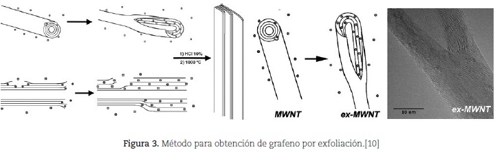 ¿Qué futuras sorpresas nos depara el grafeno? Es difícil predecirlo, pero al menos en México existen grupos que han contribuido de manera importante en el tema. Entre 2008 y 2010 el grupo de investigación de los hermanos Mauricio (hoy profesor titular en Penn State University) y Humberto Terrones Maldonado (hoy profesor visitante en Oak Ridge National Laboratory) y de Yadira Vega Cantú (en el Instituto Potosino de Investigación Científica y Tecnológica, ipicyt), publicaron sus resultados sobre el desarrollo de métodos muy eficientes para la producción de hojas y listones de grafeno a partir de nanotubos de carbono multicapa (mwnt s; Campos-Delgado, et al., 2008; Cano Marquez et al., 2009; Elias et al., 2010) (figura 3).