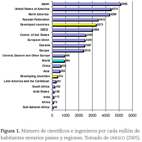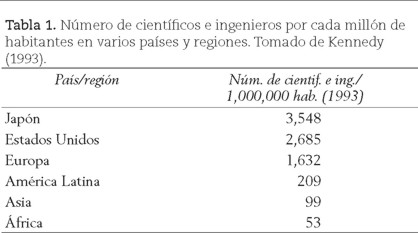 Presentan también los datos de Kennedy (1993) sobre el número de científicos e ingenieros por cada millón de pobladores de algunos países y regiones del mundo (ver la tabla 1).