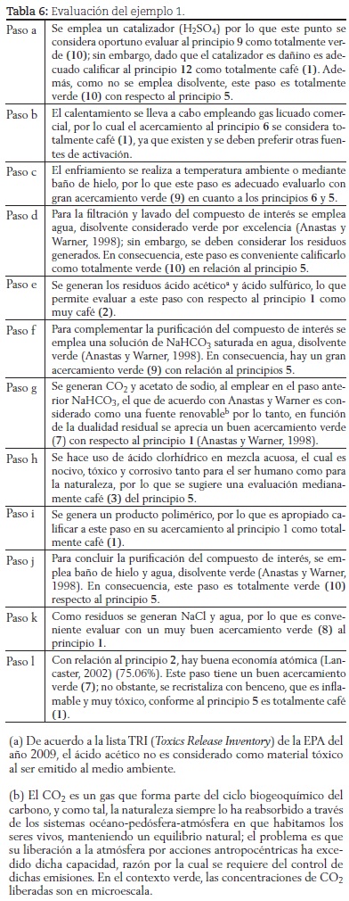 Evaluación del acercamiento verde del proceso del ejemplo 1: Siguiendo los pasos, conforme al diagrama de flujo (figura 3), se presenta a continuación la evaluación del proceso en la tabla 6.