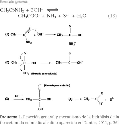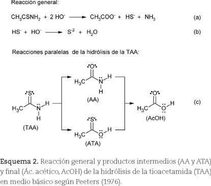 Obsérvese además, que en ese mecanismo se usaron dos grupos hidroxilo para realizar la hidrólisis de la tioacetamida, TAA, lo cual es incongruente con la estequiometria de la reacción general planteada, en la que se implica la participación de tres de ellos. Según varios autores (i. e. Buscarons, 1986; Hodes, 2002), la hidrólisis de un equivalente de tioacetamida consume dos equivalentes de hidróxido (esquema 2a), por lo que el tercer equivalente se utiliza en la reacción ácido-base con el HS− para liberar al anión S2− (esquema 2b) implicado en la precipitación de los cationes en estudio.