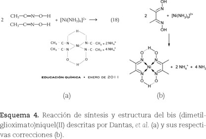 Asimismo, siento que es muy importante corregir las fórmulas usadas para describir la síntesis y la estructura del bis(dimetilglioximato)níquel(II) descritas en la ecuación 18, página 36, pues en ésta inexplicablemente aparecen hidrógenos divalentes (esquema 4a). Al respecto te comento que he encontrado estudiantes con este tipo de ideas alternativas, las cuales muchas veces se generan debido a que en los cursos de química general de bachillerato y de licenciatura, se hace más caso a la enseñanza de la nomenclatura que a la escritura de las fórmulas desarrolladas.