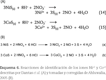 Al intentar corregir las ecuaciones 22 y 23, me di cuenta de que hay una inconsistencia entre lo dicho en el texto y lo indicado en el diagrama de flujo presentado en la figura 1 de su artículo, en el que no se muestra el uso de HNO2 (un gas poco estable que debe generarse in situ) sino de HNO3. A falta de una técnica experimental precisa, encontré en la literatura que el Mn(OH)2 obtenido en el paso anterior, se disuelve en HNO3 para dar Mn(NO3)2, el cual posteriormente se calienta en presencia de PbO2 para favorecer la oxidación del Mn+2 a Mn+7. La presencia de una coloración violeta debida al ión MnO4− al enfriarse la solución es prueba positiva para el ión Mn+2 (Eagleson, 1994; Satake, 2003; Tata, 2009). Por lo tanto, las ecuaciones correspondientes serían (esquema 5B).