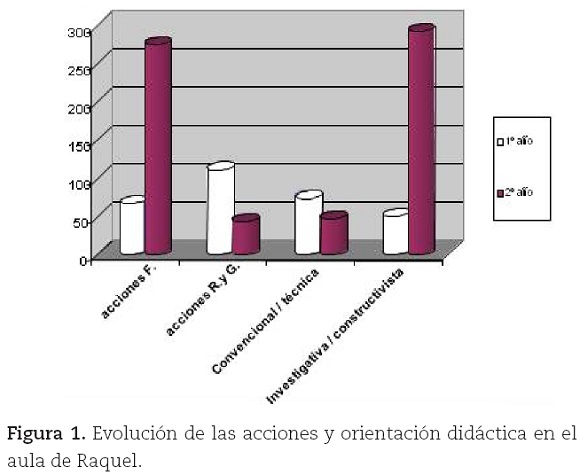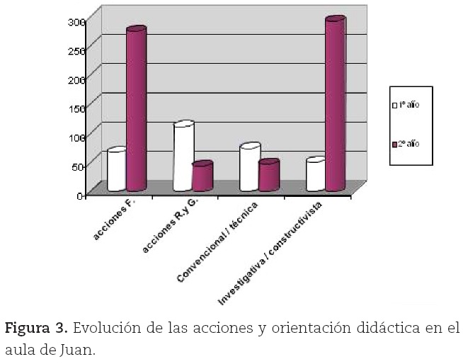 Durante el primer año los tres profesores compartieron rasgos de ambas orientaciones: la técnica-convencional, más centrada en el profesor y la enseñanza, y la investigativa-constructivista, más centrada en el alumno y en el aprendizaje, aunque con predominio de la orientación técnica-convencional. En este primer año el eje de la clase fue la explicación del profesor, con el libro de texto como principal elemento mediador de la enseñanza. Los tres profesores realizaron algunas actividades, pero de forma puntual y dirigidas fundamentalmente a la aplicación o demostración de lo explicado. La evaluación fue sobre todo sumativa encaminada a determinar el nivel alcanzado por los alumnos.