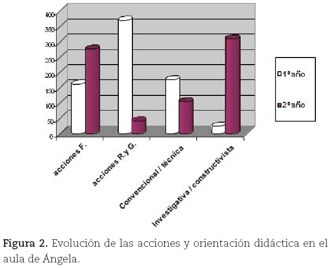 Otro aspecto de la práctica de aula analizado fueron las acciones que generaron (G) o reforzaron (R) las ideas alternativas de los alumnos o, por el contrario, las acciones que fomentaron (F) el cambio conceptual de las mismas (figuras 1, 2 y 3). Durante el primer año fueron más numerosas en los tres profesores las acciones que generaron o reforzaron las ideas alternativas de los alumnos. En cambio durante el segundo año en los tres profesores fueron más numerosas las acciones que fomentaron el cambio conceptual, especialmente en Juan y Ángela. En el caso de Raquel aun durante el segundo año fueron ligeramente más numerosas las acciones que reforzaron o generaron ideas alternativas en los estudiantes en las categorías metodología, conocimiento didáctico del contenido y evaluación.