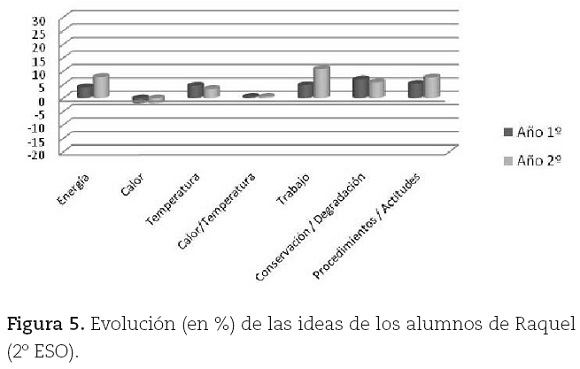 En los conceptos de conservación y degradación todos los alumnos del segundo año de la investigación mejoraron sus resultados al final del curso, aunque en el caso de Raquel la mejora fue menor que la del primer año. Estos alumnos modificaron su idea anterior respecto a que la energía "desaparece", hacia considerar que la energía se transforma. Sin embargo, no progresaron en el concepto de conservación como un principio general de la física (Solbes y Tarín, 1998).