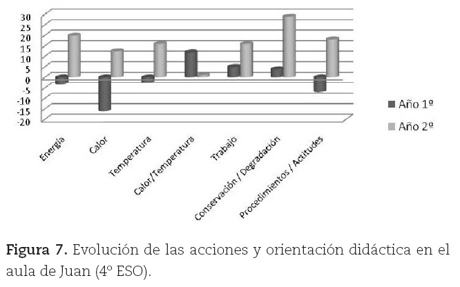 Con relación a la evolución de las ideas de los alumnos, durante el segundo año se produjo una evolución general en los conceptos de energía y trabajo y en los procedimientos y actitudes. En cambio los resultados son irregulares en los conceptos de calor y temperatura y en los procesos de conservación y degradación. Los conceptos de calor y temperatura nos indican los núcleos duros, en los que las ideas alternativas de los alumnos están más arraigadas y son más difíciles de reestructurar.
