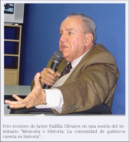 El doctor Padilla nos escribió una semblanza personal a Mina Kleiche-Dray y a mí como parte de su presentación en el Seminario "Memoria e Historia: La comunidad de químicos cuenta su historia", con la que nos distinguió el día 12 de mayo de 2008 y que salió finalmente publicada en 2009 en el Boletín de la Sociedad Química de México, vol. 3, núm. ,1, pp. 38-49, con el título "Facultad de Química de la UNAM. 1967, un paso a la modernidad", que puede bajarse de la URL http://www.bsqm.org.mx/PDFS/V3/N1/08-Javier%20Padilla%20Olivares.pdf .Transcribo a continuación algunos de los pasajes de su primera entrega, que es mucho más detallada que el artículo final, y que nos habla desde su nacimiento hasta su paso a la Facultad de Química y sus primeros tiempos en ella en el año 1966.
