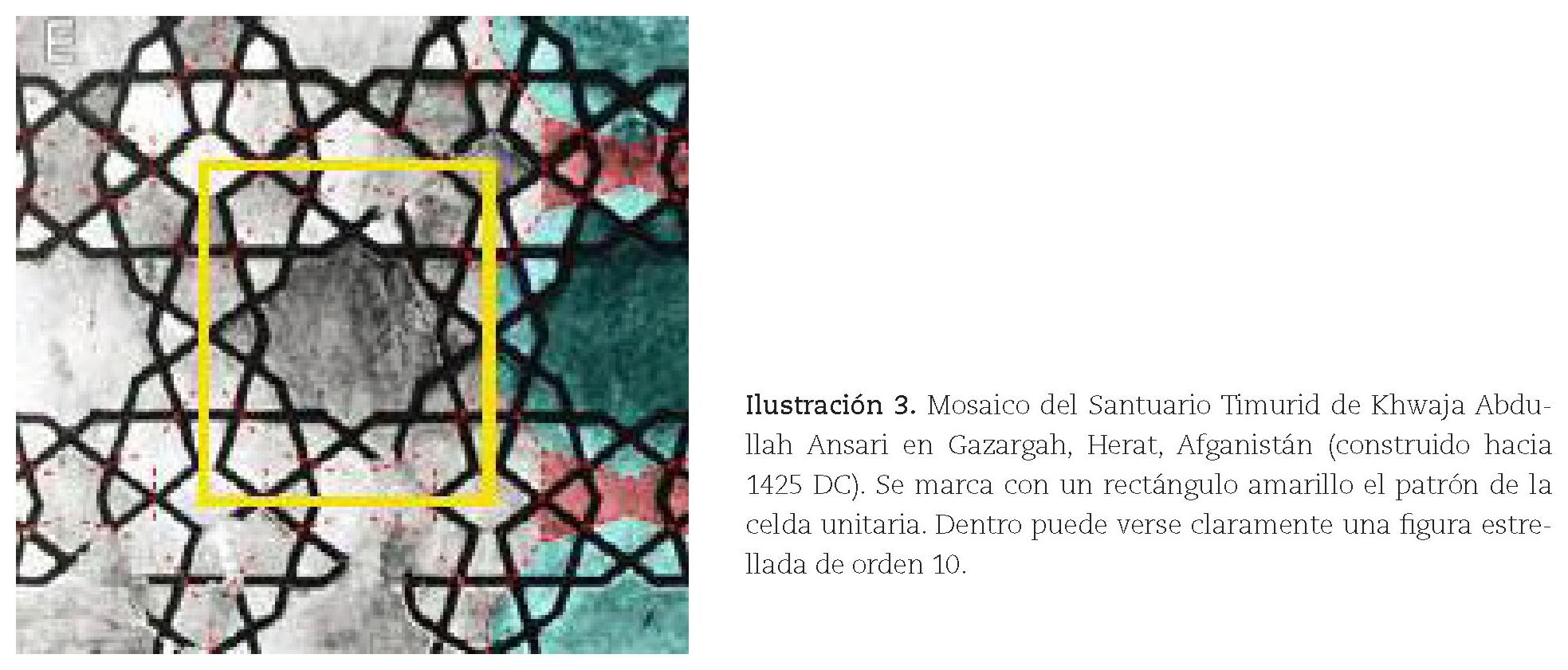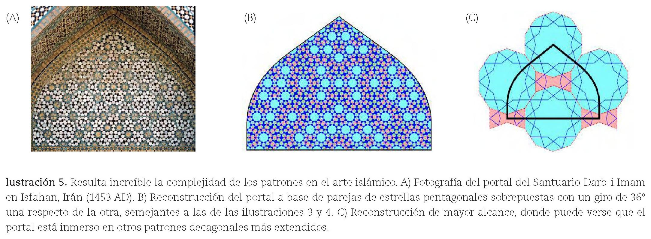 Lu & Steinhardt (2007) llamaron la atención de los científicos con una publicación en la revista Science en la que nos hablan de la existencia de figuras de orden 5 y 10 en los mosaicos de las construcciones islámicas de la Edad Media (ver las ilustraciones 3 y 4). Aunque nos hacen ver que ello fue detectado desde muchos años atrás por algunos matemáticos, como El-Said & Parman (1976) o Schneider (1980).