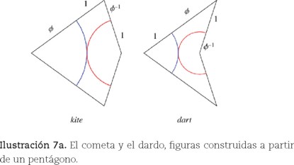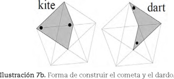 Este físico-matemático construyó dos figuras planas (ver la ilustración 7a), llamadas «cometa» (kite) y «dardo» (dart), construidas a partir de un pentágono (ver la ilustración 7b; el ángulo mostrado en azul en las dos ilustraciones 7a mide 72°). Se trata de ir poniendo estas figuras de tal forma que las marcas coloreadas coincidan. Por ejemplo, en la ilustración 8 puede lograrse la construcción de figuras de orden 5 con una o la otra. En la ilustración 9 aparecen versiones más complejas obtenidas con las mismas dos figuras.