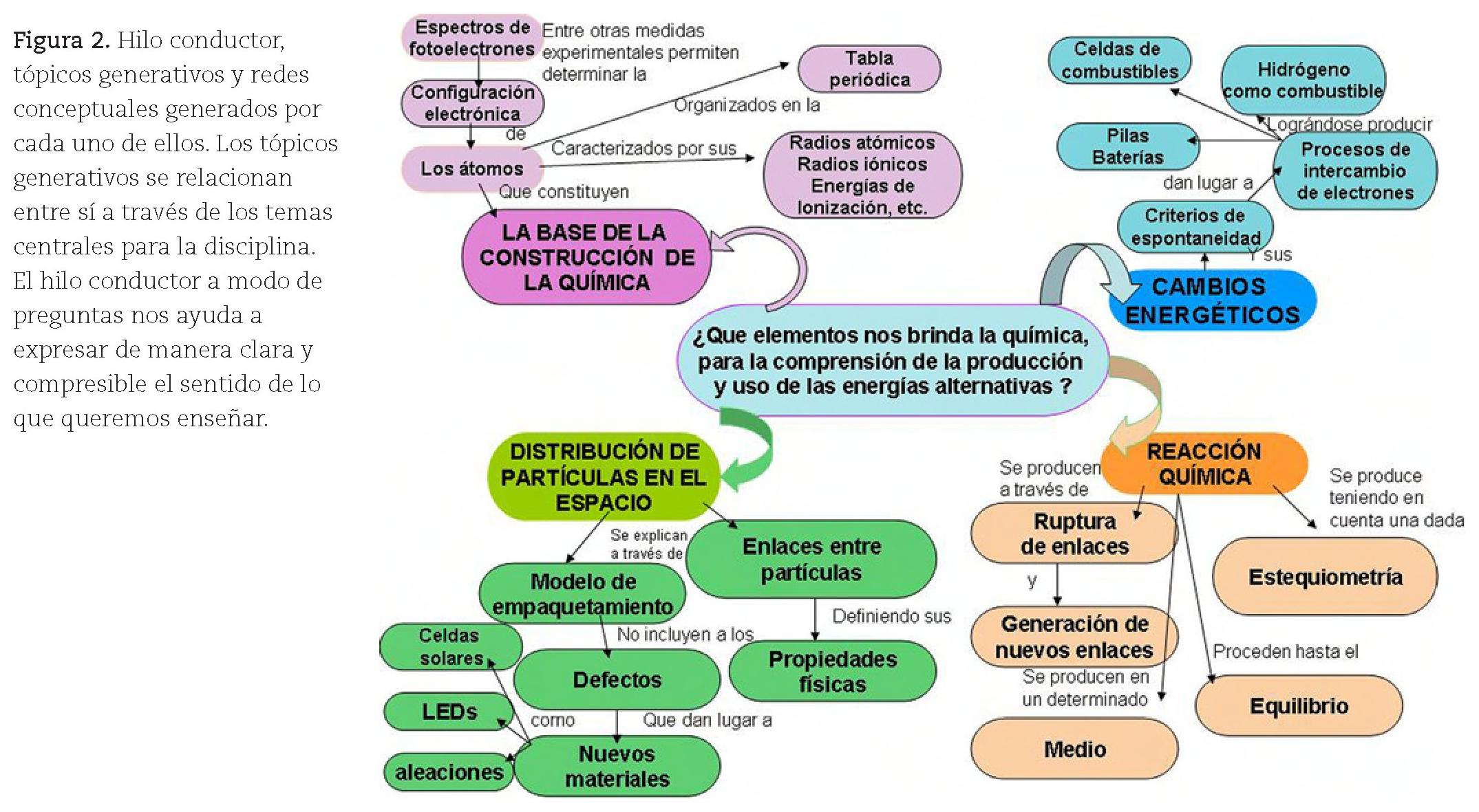 En la figura 2 las flechas de color (al centro) nos muestran la conexión permanente entre el hilo conductor y los tópicos generativos, mientras que las de color negro nos muestran las interacciones entre las redes conceptuales de cada tópico. Las interrelaciones mostradas, en la figura son sólo algunas de las posibles, estos diagramas deben estar caracterizados por una alta flexibilidad para encontrar múltiples conexiones y de este modo poder profundizar en las comprensiones alcanzadas por los alumnos.