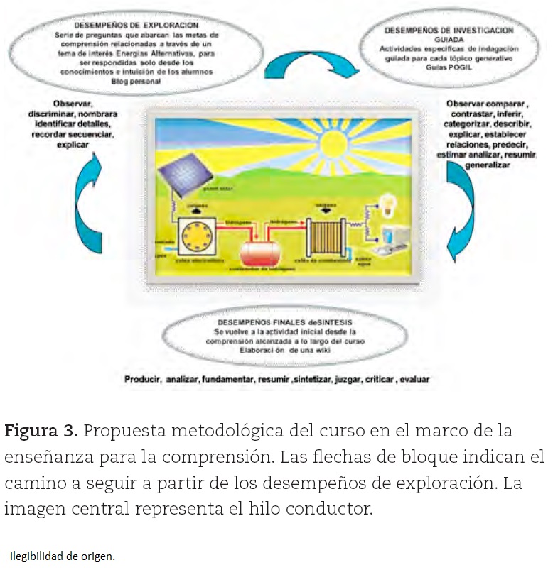 Una de las dificultades en el aprendizaje de la Química en alumnos recursantes de carreras de correlación consiste en dar respuesta a sus preguntas ¿para qué necesitamos aprender química? ¿Por qué tengo que aprender esto, si ya lo sé? Esto motivó encarar una metodología basada en el marco conceptual de la "Enseñanza para la comprensión" que se aplicó en un curso de Química a distancia, con evaluación presencial. Para ello diseñamos una secuencia didáctica centrada en la comprensión. Empleando "Energías alternativas" como hilo conductor y desarrollando cuatro tópicos generativos. Luego se consideró necesario detallar los pasos necesarios para la adaptación de la metodología mediante el diseño de una secuencia didáctica a través de la utilización de las TIC, usando un proceso de indagación guiada, con apoyatura tutorial en los foros de discusión on-line, hasta llegar a la etapa de síntesis, donde se reflejan los niveles de comprensión alcanzados. El propósito es mejorar los desempeños de comprensión en la mayoría de los estudiantes, y los resultados nos alientan a continuar con esta propuesta y a desarrollar otras similares.