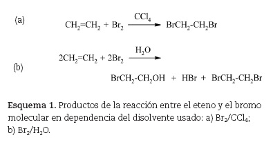 Para explicar lo anterior podríamos citar el caso de las reacciones competitivas de sustitución nucleofílica versus las de eliminación, pero para ser más explícitos retomamos la reacción mencionada en el ítem 3: La reacción del eteno con bromo molecular, la cual puede dar uno o más productos dependiendo del disolvente en el que se encuentre el bromo.2 Por ejemplo: 1) Se produce el 1,2-dibromoetano si el bromo se encuentra disuelto en CCl4 , y 2) Se obtienen el 2-bromoetan-1-ol (ca. 70 %) más el 1,2-dibromoetano si el bromo se disuelve en agua (esquema 1a y 1b, respectivamente).