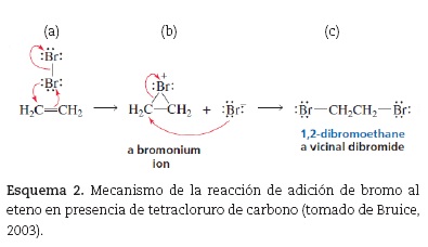 El mecanismo simplificado de esta reacción consta de dos pasos: en primer término se presenta el ataque electrofílico del bromo al doble enlace carbono-carbono con desprendimiento del ión bromuro (paso lento, esquema 2a), el cual ataca nucleofílicamente a uno de los carbonos del ión bromonio por la parte opuesta al Br+ (paso rápido; adición anti; esquema 2b).