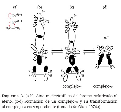 Desde el punto de vista teórico, para que ocurra el ataque mostrado en el esquema 2a, el enlace Br-Br debe polarizarse (esquema 3a: inducción de un dipolo eléctrico (electrónico) en el bromo) de tal forma que se explique su ruptura heterolítica. Nos encantaría decir que el enlace-π del alqueno también debería polarizarse; no obstante en 1974, George A. Olah (Premio Nobel de Química en 1994) propuso un mecanismo en el que el bromo polarizado ataca al eteno (esquema 3b) "insertándose" entre los "orbitales-p" de los carbonos involucrados en el enlace-π para generar un complejo-π (esquema 3c) que posteriormente se transforma al complejo-σ o ión bromonio mostrado en el esquema 3d (Olah, 1974a-b).