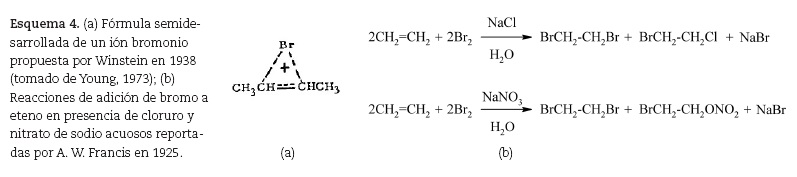 Siempre atendiendo a los resultados experimentales, el ión bromonio fue propuesto en 1938 por Saul Winstein, uno de los pioneros en estructuras de cationes no-clásicos (esquema 4a: Young, 1973). La formación del ión bromonio pudo, por ejemplo, explicar los resultados obtenidos por A. W. Francis en 1925, con respecto a la reacción de eteno con bromo en presencia de cloruro de sodio acuoso para dar 1,2-dibromoe-tano más 1-bromo-2-cloroetano (parte superior del esquema 4b) y la reacción de eteno con bromo en presencia de nitrato de sodio acuoso para producir 1,2-dibromoetano más nitrato de 2-bromoetilo (parte inferior del esquema 4b) (Francis, 1925).
