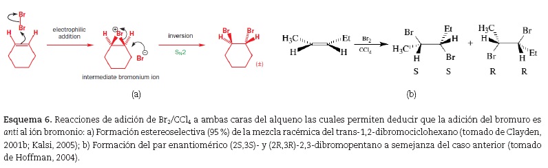 Por otro lado, se pudo deducir que la estereoquímica de la adición es anti al ión bromonio en compuestos con rotación limitada en la cadena de carbonos (esquema 6a) o en compuestos con una estereoquímica conocida como en el caso de la adición de Br2/CCl4 al (2Z)-pent-2-eno, en el que la formación del ión bromonio en ambas caras del doble enlace produce la mezcla 1:1 de (2S,3S)-2,3-dibromopentano y (2R,3R)-2,3-dibromopentano, pero no el par (2R,3S)/(2S,3R) que correspondería a la formación del carbocatión con giro más o menos libre en torno al enlace C2-C3 (esquema 6b).