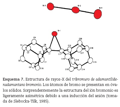 Aún más, cuando en un mecanismo de reacción decimos/escuchamos los términos "estado de transición" o "compuesto intermediario", nos imaginamos estructuras hipotéticas que solamente se pueden deducir a partir del análisis de los productos. Al respecto, un mejor seguimiento del curso de una reacción química ha sido posible gracias al desarrollo de técnicas espectroscópicas sofisticadas tales como la RMN13C (Schubert, 2008) y la de femtosegundo (desarrollada por Ahmed H. Zewail, premio Nobel de Química 1999 (De Schryver, 2001)). Y por si quedaran dudas, la genialidad y el esfuerzo de investigadores como Slebocka-Tilk, Ball y Brown, las disuelven con resultados tales como la estructura de rayos-X en monocristal del tribromuro de adamantilidenadamantano bromonio (esquema 7: Slebocka-Tilk, 1985), los cuales nos hacen pensar en lo inexactas o limitadas que pueden ser las definiciones que usamos día a día.