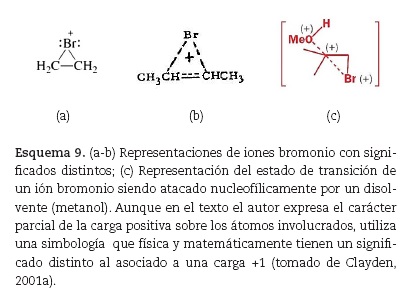 Por supuesto que la enseñanza de la química orgánica tiene su grado de complejidad, sobre todo si analizamos los esquemas presentados por distintos autores. Por ejemplo, las representaciones del ión bromonio de los esquemas 2b y 4a, replicados en el esquema 9, significan "cosas distintas": la representación de la izquierda muestra tres enlaces sigma (un C-C y dos C-Br) con una carga formal positiva sobre el bromo; en tanto que la segunda representación muestra un enlace-π carbono-carbono parcialmente roto y dos enlaces sigma carbono-bromo parcialmente formados, con la carga positiva distribuida entre esos tres átomos. De esta última se puede deducir que el orden de enlace carbono-carbono debe ser mayor de uno y que por tanto la longitud de enlace correspondiente debe ser 1.34
