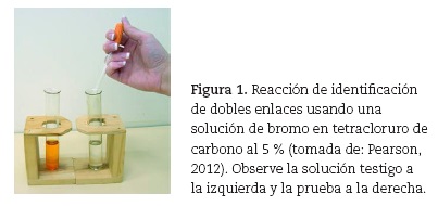 Dado que los autores no especificaron el disolvente, suponemos que se trata de la reacción ilustrada en el esquema 1a, ya que es una práctica que comúnmente se lleva a cabo en el laboratorio de química orgánica como reacción de identificación de dobles enlaces, en la que la coloración café-rojiza del Br2/CCl4 va desapareciendo conforme las moléculas del halógeno se adicionan a las moléculas del alqueno, de tal manera que un exceso de éste asegura la decoloración total de la disolución (figura 1).