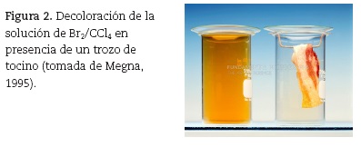 En fin que como siempre, no existe una fórmula mágica que nos indique la forma de enseñar-aprender, razón por la cual podemos y tenemos que seguir haciendo investigación para la educación como la que presentan los autores en el artículo fuente. Sin embargo, algo que nunca falla y que nunca está demás es asociar la práctica a la teoría, así que con respecto a la reacción que discutimos, nos permitimos recomendar como experiencia de cátedra a la decoloración de la solución de Br2/CCl4 al ponerla en contacto con un trozo de tocino (figura 2). En este caso la pregunta generadora de investigación para los estudiantes sería: ¿cuál es o cuáles son los alquenos que contiene el tocino y cuáles serían los productos de la adición?