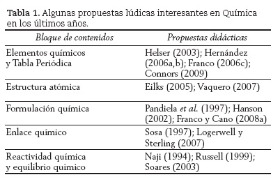 Particularmente, en los últimos años ha surgido en las diferentes revistas sobre educación científica una gran efervescencia de propuestas educativas en torno a los elementos químicos y a la Tabla Periódica. Según Linares (2004) se percibe el deseo permanente entre los docentes por buscar nuevas y motivadoras formas de enseñar estos temas. En bastantes de las propuestas se emplean juegos didácticos muy variados y otros recursos recreativos, encontrando crucigramas de muy diverso tipo, juegos de mesa, juegos de cartas, bingos, etc. A estas actividades basadas en juegos podemos sumar otras que, sin recurrir propiamente a ellos, se plantean en contextos de tipo lúdico.