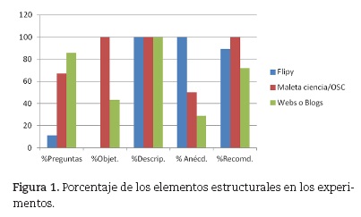 Esta primera descomposición en categorías descriptivas la hemos aplicado a las 19 experiencias seleccionadas. La figura 1 representa el porcentaje de experimentos que contienen cada uno de los elementos estructurales, en función de la fuente de la que provienen (webs/blogs; Maleta de la Ciencia o el libro Los experimentos de Flipy).