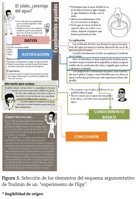 De los tres elementos necesarios para adquirir coherencia (datos, justificaciones y conclusiones), las conclusiones son las que menos aparecen. De este modo, los Los experimentos de Flipy sólo 45% de los analizados proporcionan conclusiones. En la figura 3 mostramos, a modo de ejemplo, cómo hemos ido seleccionando los diferentes componentes de un argumento y donde se observa que la posible conclusión (El jabón expulsa las moléculas de grasa, evita que se unan de nuevo y, por tanto, las hace desaparecer) se extrae de la "información para curiosos" a modo de anécdota.