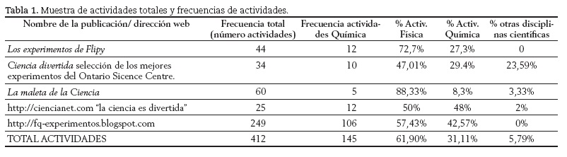 El primer paso en la selección de actividades es la clasificación de los experimentos según el fenómeno en el que se fundamenta la práctica, en las distintas disciplinas de Ciencias Experimentales (tabla 1). Una vez categorizados por áreas observamos que la Física comprendía la mayor parte de experimentos de la muestra (61,9%, ver tabla 1), y tuvimos que ampliar la búsqueda de experimentos con fenómenos químicos a páginas web y blogs de docentes donde se describen y explican experimentos de "Química cotidiana"; en concreto, incluimos en nuestra muestra intencional cuatro de estas webs: http://ciencianet.com, www.taringa.net, http://fq-experimentos.blogspot.com/, http://lacienciaencasa.webnode.es