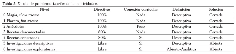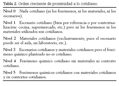 Lo primero que nos llama la atención es el alto número de actividades (15) con un elevado nivel de proximidad a lo cotidiano, siguiéndole las actividades que utilizan materiales y escenarios cotidianos pero el fenómeno químico no lo es (nivel 3 con cinco actividades). Refiriéndonos al grado de problematización, predominan las actividades clasificadas en el intervalo (3-4) actividades tipo recetas conectadas o no a contenidos del currículo (16). En cuanto a las actividades con nivel 5-6 (planteamiento de problemas o investigaciones) sólo hallamos tres.