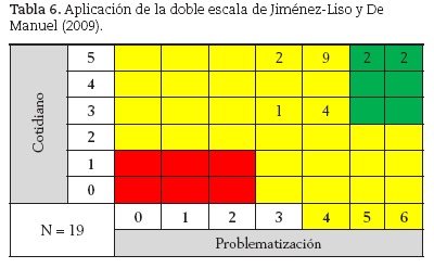 En la tabla 6 mostramos el resumen de la aplicación de la doble escala de proximidad a lo cotidiano y de problematización de Jiménez-Liso y De Manuel (2009) a la muestra de actividades seleccionadas (N = 19).