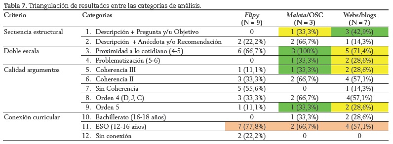 Con el objeto de favorecer la comparación entre los recursos, en la tabla 7 realizamos una confrontación de algunas de las categorías de análisis de contenido descritas en los apartados anteriores en función del recurso utilizado. Por ejemplo, para la secuencia estructural sólo incluimos las dos situaciones extremas, para la doble escala los niveles más altos de cotidianeidad y problematización, etc.