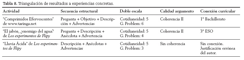 Estos resultados ponen de manifiesto que los experimentos Química cotidiana de la muestra utilizada (libros, webs y blogs) mejoran su aplicabilidad en el aula con respecto a los resultados obtenidos en otras muestras de actividades en ferias y congresos (Jiménez-Liso y De Manuel, 2009). Aunque en este trabajo la muestra analizada es limitada, en un futuro queremos ampliar este análisis a otras fuentes, en los diferentes formatos existentes.