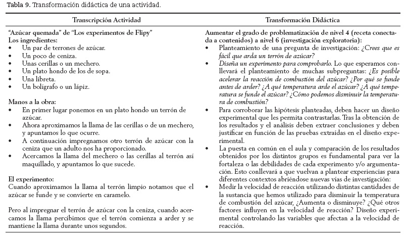 Una vez establecidos los criterios de transformación didáctica, el siguiente paso sería mostrar la alternativa de cada una de las actividades analizadas, y aunque nos gustaría incluir todas las transformaciones didácticas planteadas en nuestro trabajo, por motivos de espacio hemos optado por ejemplificar con la actividad "Azúcar quemada" de Los experimentos de Flipy (tabla 9).
