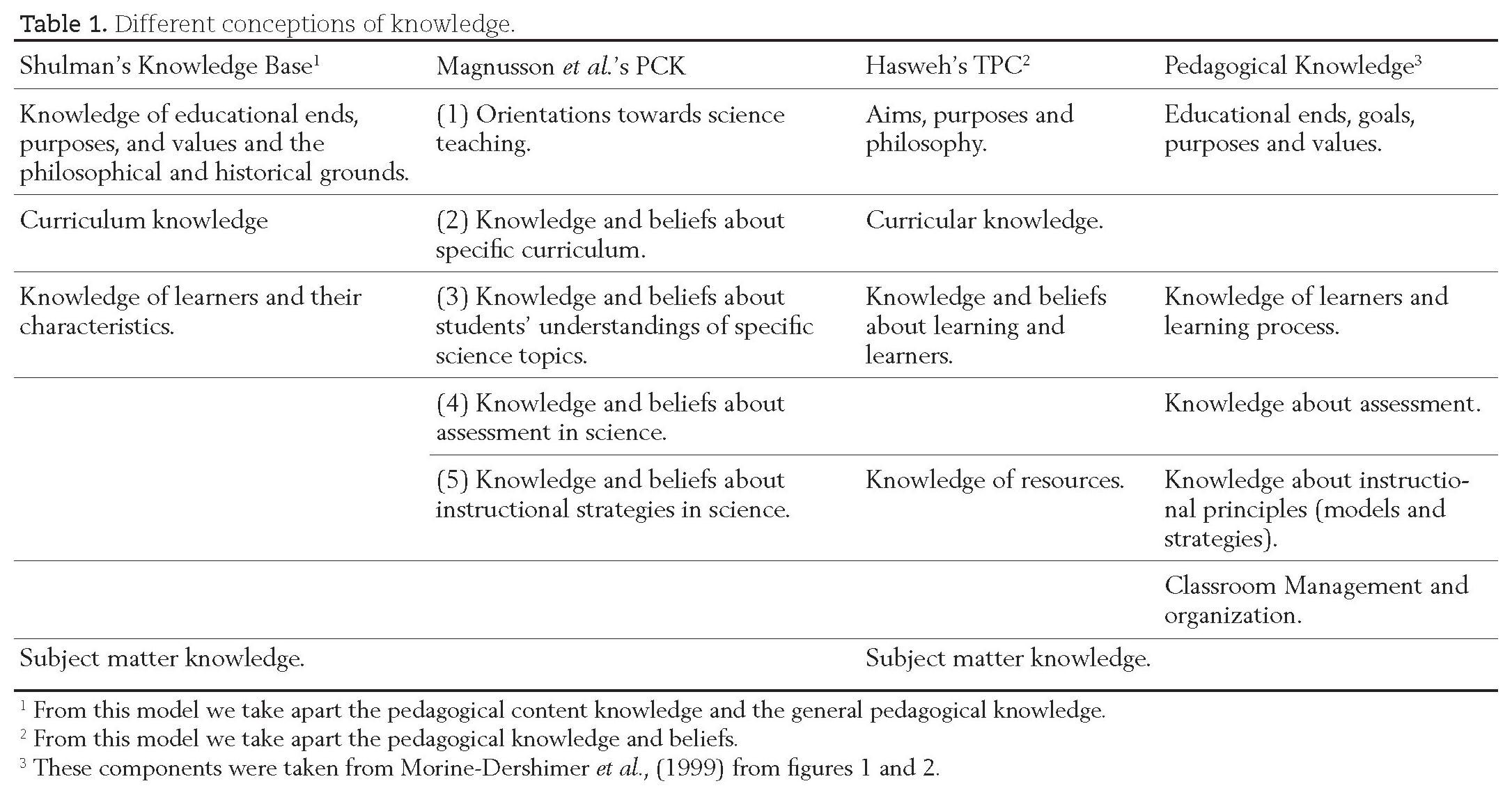 In the science education community, a well-accepted model related to what PCK should be, was elaborated by Magnusson et al. (1999). These authors claim that PCK is "a teachers' understanding of how to help students to understand one specific subject matter", and describe PCK as the knowledge that is acquired after a transformation from various sources of knowledge: subject matter knowledge, pedagogical knowledge and knowledge about the context. The combination of these three main sources leads to the formation of pedagogical content knowledge. According to these authors PCK has five components: 1) Orientation towards teaching science; 2) Knowledge of science curricula; 3) Knowledge of students' understanding of science; 4) Knowledge of assessment of scientific literacy, and 5) Knowledge of instructional strategies. In this proposal the last four components are all interrelated with the first one. Although in these PCK components almost all knowledge that science teachers should have is included, Magnusson et al. (1999) do not include subject matter knowledge per se, the one in which every teacher should be an expert, and as Gil-Pérez (1991, p. 72) said, "a good knowledge of the subject must include: knowledge about the history and philosophy of the subject, knowledge of the teaching methodologies, knowledge of the relationships among science-technology-society, knowledge about recent proposals or discoveries and to have some knowledge of those subjects related". As a resumé, in Table 1 we show four PCK's models taken from literature.