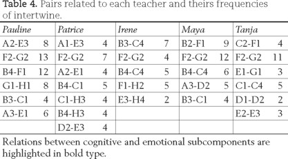In table 4, we present the frequencies of different pairs of subcomponents for each teacher. These frequencies were obtained by counting how many times each pair of components in the interview appeared in the same fragment.