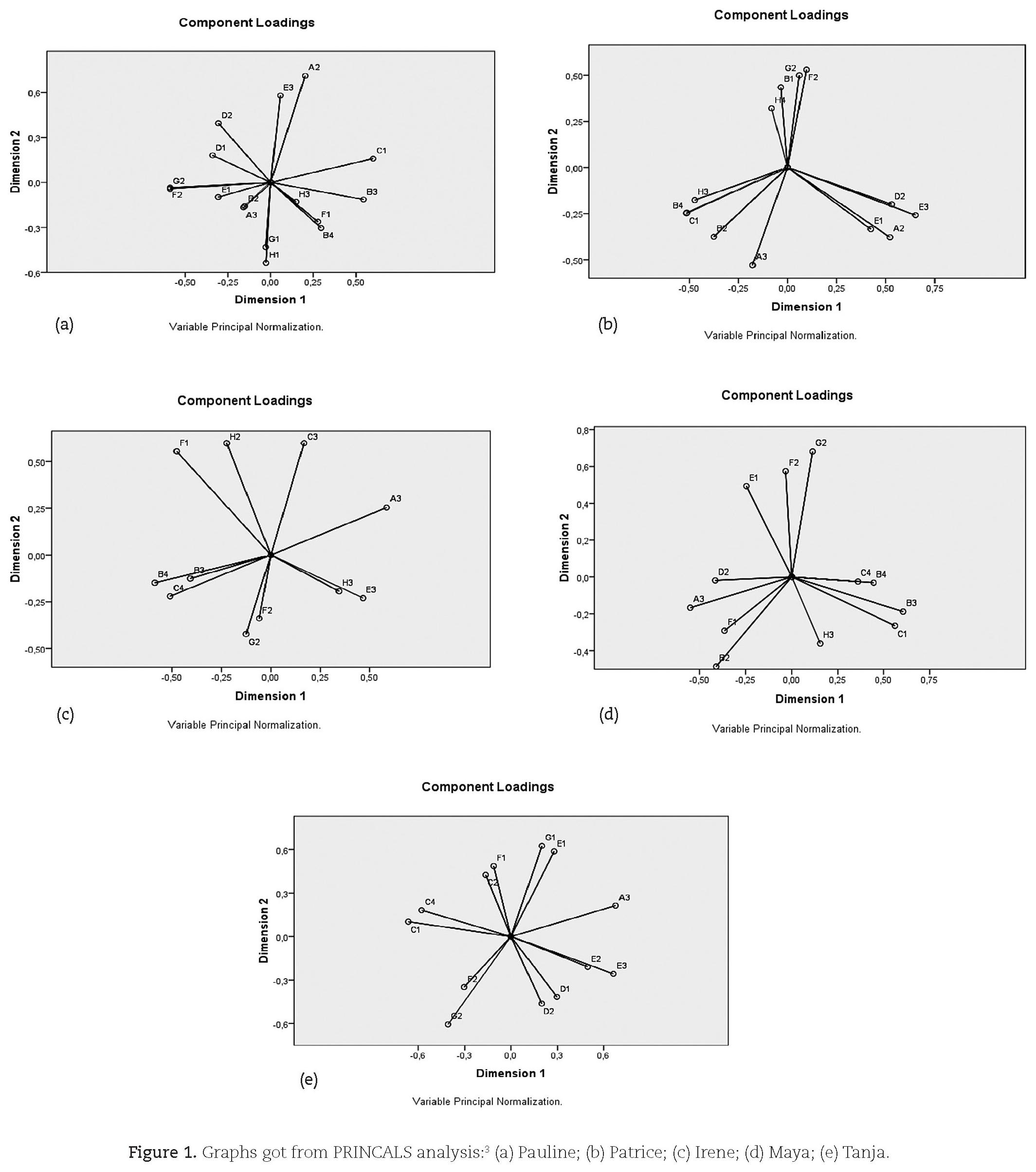 Pauline's interview was the longest in time and information. We could obtain 94 fragments to classify. The PRINCALS graphs (figure 1.a) show four important pairs of components. These are: A2-E3, F2-G2, G1-H1, B4-F1. All these pairs have a good correlation and fit very well in the whole solution, besides have a good frequency of intertwine (see table 4). Each pair will be discussed individually. The first pair of components is F2-G2 is related with the emotional part of teaching. In this case the interview contained phrases like the following:
