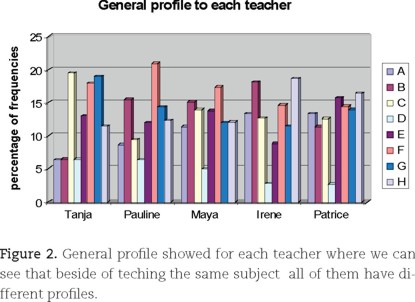 In figure 2 we can see the profiles of each teacher. It is important to remark that emotional components are quite important to all of them as well as D component is not as important as should be because is the component related to how they assess students learning. For Tanja C component is the most important as well as A and B are not as important in her profile. For the others teachers B component has more weight.