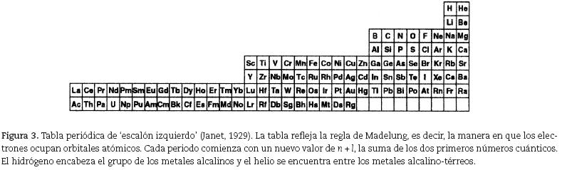 1 La tabla de 'escalón izquierdo', propuesta por Charles Janet en 1929 (figura 3), revivida por Gary Katz (2001) y con Henry Bent (2006) como uno de sus principales divulgadores, así como la tabla piramidal modificada (Scerri, 2004) expresan naturalmente la manera en la cual cada periodo comienza con un nuevo valor de n + l. Este criterio terciario, sin embargo, no es aceptado de manera unánime, dado que se ha sugerido que debería proveer una tercera dimensión a la tabla periódica (Magarshak y Malinsky 1992).