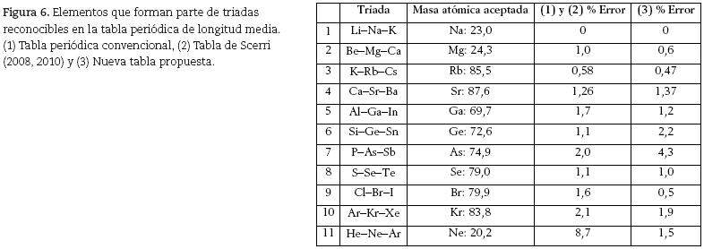 como analizaremos en la sección 6, la tabla propuesta maximiza las triadas de número atómico, tal como aboga Scerri (2010, 2011c) en sus últimos trabajos, y en un mayor número que en las tablas que ha propuesto. Dicha maximización de las triadas permitirá advertir que la adecuada capacidad predictiva de las masas atómicas que presenta la tabla periódica propuesta comparada tanto con la tabla de longitud media (figura 4) como con la tabla de 'escalón izquierdo' modificada (figura 5).