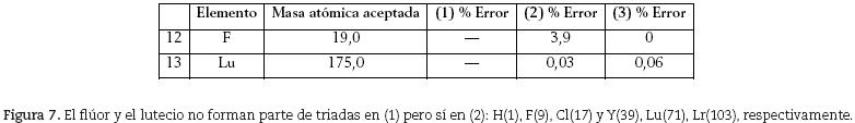 Puede apreciarse que el sistema periódico propuesto muestra una capacidad predictiva de las masas atómicas superior (cercana al 70%) comparado con los dos restantes. Y en los casos en que presenta un mayor porcentaje de error, éste es cercano al valor menor, con excepción del As. En dicha tabla periódica apreciaremos también que los elementos forman parte, al menos, de dos triadas de número atómico con excepción del As, Ge y Ne. Por ejemplo, para el flúor y el lutecio serían las siguientes: C(6), F(9), Mg(12) o bien F(9), Na(11), Al (13); lo mismo sucede con el Lu: Tm(69), Lu(71), Ta(73), así como Lu(71), Ta (73), Re (75), o bien Ho(67), Tm(69), Lu(71).