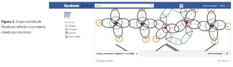 El objetivo de nuestro trabajo es analizar el uso de plataformas virtuales por parte de los alumnos que se encuentran cursando la asignatura Química Orgánica II, materia del segundo año de las carreras de Farmacia y Bioquímica de la Universidad de Buenos Aires. Para ello comparamos el uso del Campus Virtual de la materia, basado en la plataforma Moodle (figura 1), y la participación en grupos de Facebook como ejemplos de apoyos educativos formales e informales, respectivamente, para el seguimiento de la materia. En el caso de Facebook, se trata de un grupo cerrado creado por los alumnos con 446 miembros denominado "Estoy cursando orgánica 2en FFyB" (figura 2).